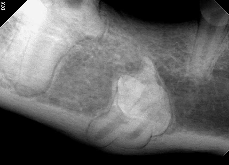 More times than one may think, missing teeth may actually be impacted, which results in a condition that can be very serious for the patient. Dentigerous cyst formation can deteriorate much of the surrounding bone in which the impacted tooth is embedded. Although these cysts are not malignant, they destroy the surrounding alveolar bone as they expand, resulting in the loss of adjacent teeth. Unfortunately, the patient may never alert the owner to any pain or discomfort. In fact, enough destruction can occur over a short period that it leaves the bone vulnerable to fracture.