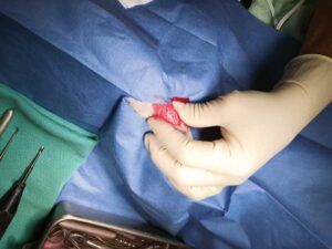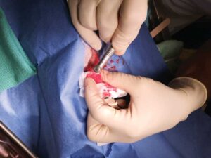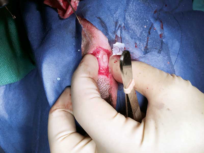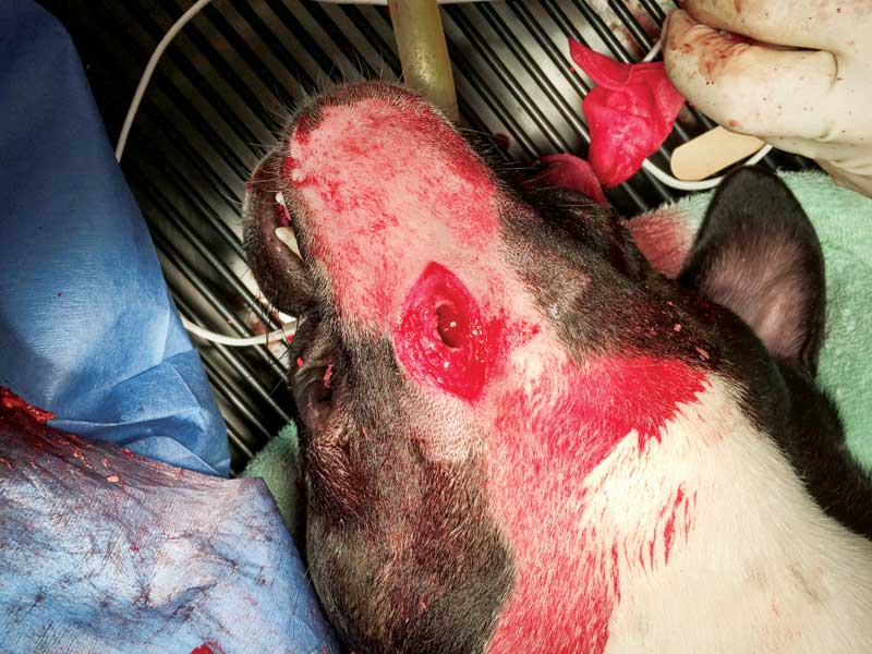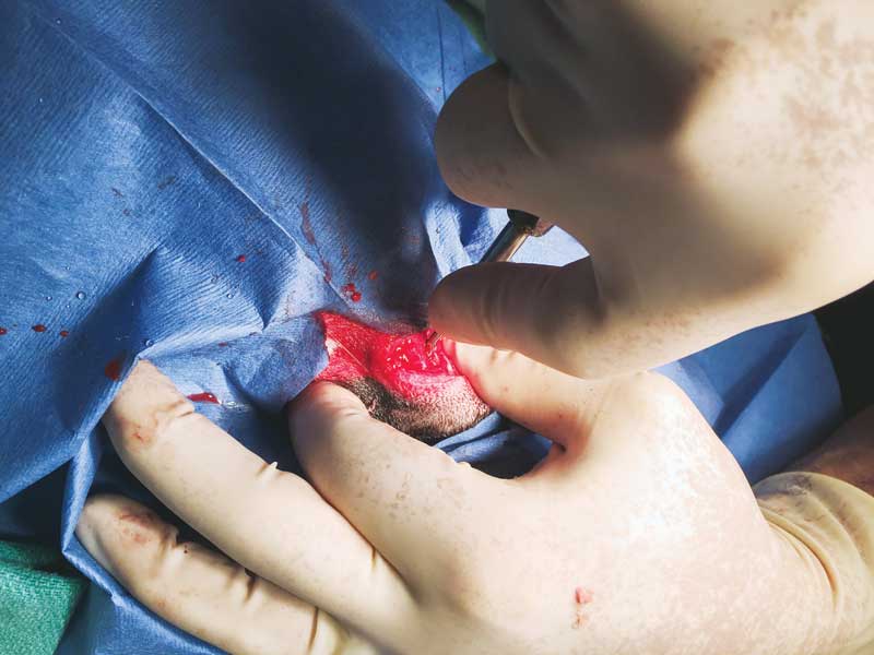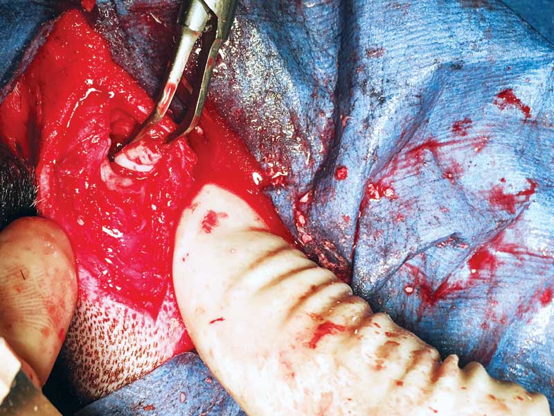 Given the deep location of the tooth, the patient was placed in dorsal recumbency and the area on his lower-right mandible below tooth #408 was surgically prepared. A hypodermic needle was placed and further radiographs were performed to help determine the exact location of the impacted premolar within the mandible (Figure 3). A surgical incision was created and the underlying mandibular bone was exposed (Figure 4). Using a #8 round bur and copious lavage with sterile saline, the mandibular bone was slowly removed until tooth structure was visualized (Figures 5 and 6).