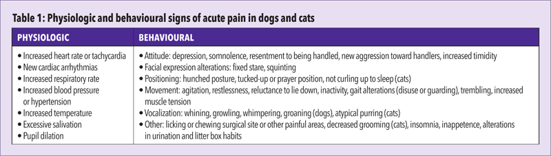 A pain-scoring system may be utilized to raise awareness regarding the individual patient’s pain severity and can help guide analgesic needs. For example, a numeric rating scale (NRS) can be used to assess pain by evaluating different behaviours and assigning a numeric score to each. Vocalization, movement, and degree of agitation are common behavioural categories used in a simple NRS. While no one tool or system for evaluating pain in cats and dogs has been adopted as gold standard, it is recommended hospitalized patients be assigned a pain score that can be reassessed during each shift, using the same scoring system.3 A combination of physiologic and behavioural signs can be used to construct the pain score (Table 1). Every patient deserves pain-recognition advocacy. Once pain assessment has been made, a multimodal treatment plan can be constructed.