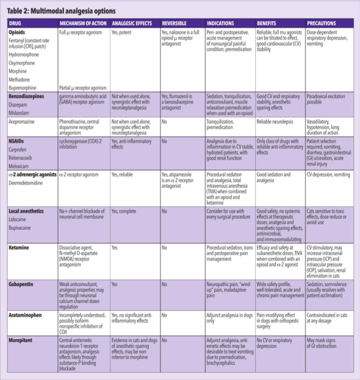 A multimodal approach can optimize analgesia by targeting multiple nociceptive pathways, while minimizing morbidity through anesthetic-sparing effects and reduced dosing needs of any one drug. Integrative approaches to pain management also deserve consideration as more approved products become available.