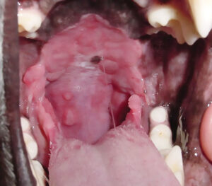 Cats and dogs may deal with eosinophilic oral disease differently. Clinically, nearly every case I’ve seen of canine eosinophilic oral lesions has presented with a history of chattering, whereas cats affected by oral eosinophilic granuloma do not seem to show chattering as a consistent finding.
